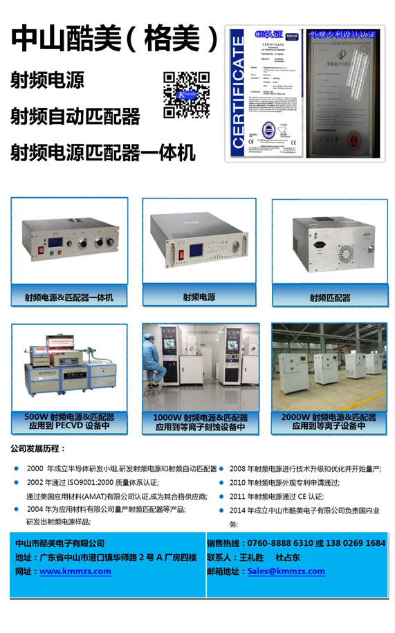 中山市酷美電子有限公司是一家專業(yè)從事半導(dǎo)體制造設(shè)備研發(fā)、設(shè)計(jì)和制造的高科技合資企業(yè)。產(chǎn)品主要有射頻電源、射頻自動(dòng)匹配器、射頻功率分配器,廣泛用于太陽能光伏系統(tǒng)、PECVD、真空鍍鏌、刻蝕等真空設(shè)備當(dāng)中。公司于2000年進(jìn)入半導(dǎo)體領(lǐng)域,已有15年豐富的行業(yè)經(jīng)驗(yàn)。2002年,成為全球最大的半導(dǎo)體設(shè)備制造商AMAT(美國應(yīng)用材料公司APPLIED MATERIALS INC)認(rèn)證的供應(yīng)商,并為AMAT大批量制造射頻匹配器等產(chǎn)品,每年DMR比率控制在1%之內(nèi)。